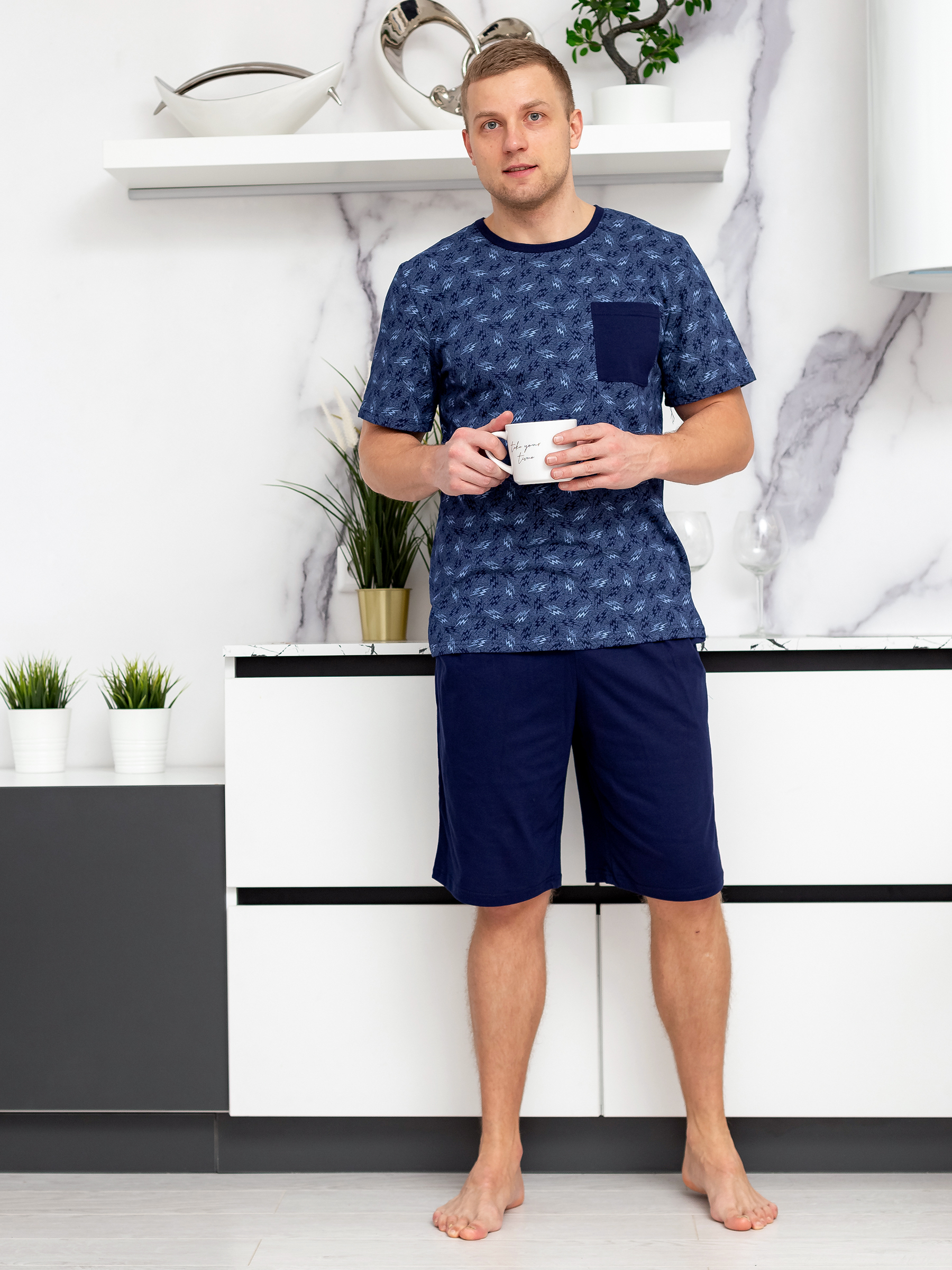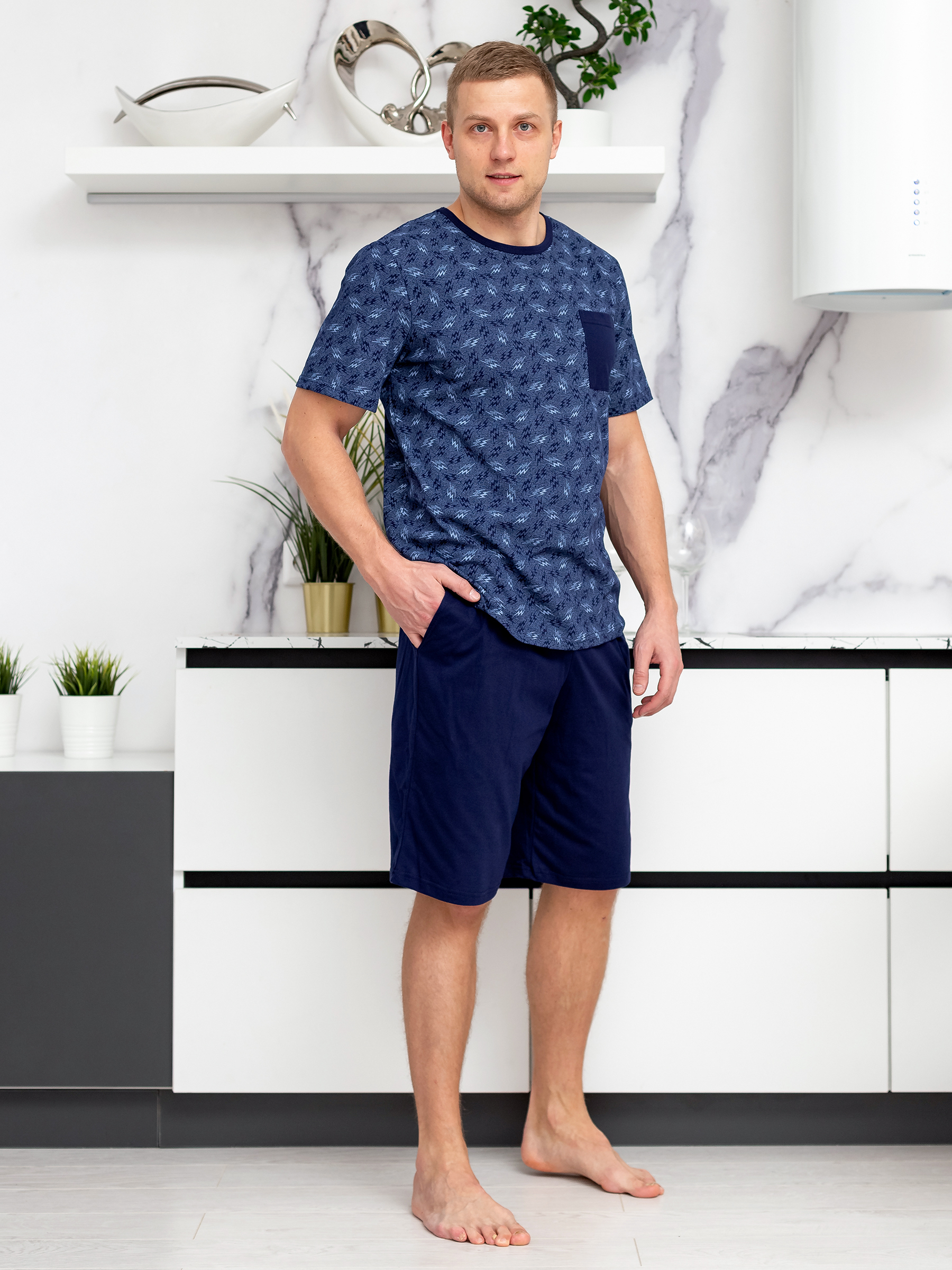 Комплект мужской для дома состоит и шорт домашних с вместительными карманами, в которые удобно положить телефон, деньги, ключи и т.д, пояс на широкой резинке, которая хорошо зафиксирована, благодаря этому не перекручивается внутри и футболки с короткими втачными рукавами и накладным карманом на груди горловина округлая.